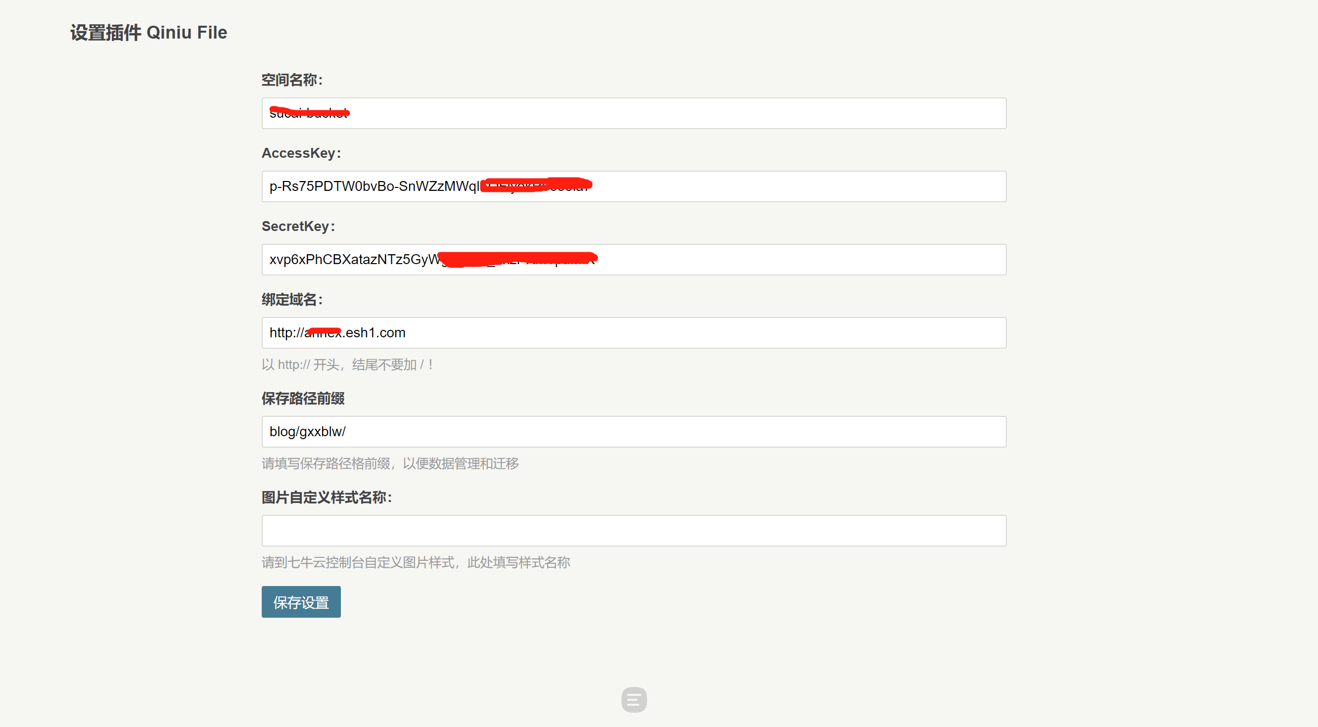 登录博客后台在 控制台->插件 页面处将新上传的插件激活,激活成功后点击插件 设置 按钮,按要求填写七牛服务的配置项。